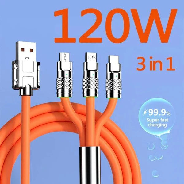 Flex: 120W 3-in-1 Liquid Silicone Tangle-Free Fast Charging Cable with Type-C, Micro-USB & Lightning Connectors